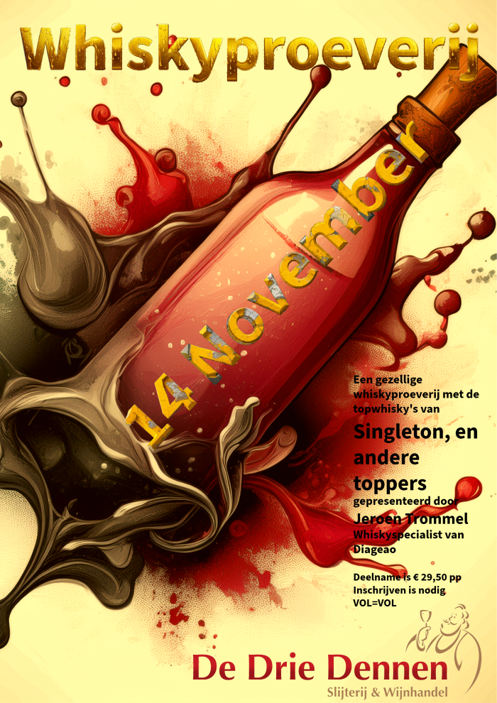 Een whiskyproeverij die je niet mag missen op vrijdag 14-11 start 19.30 uur